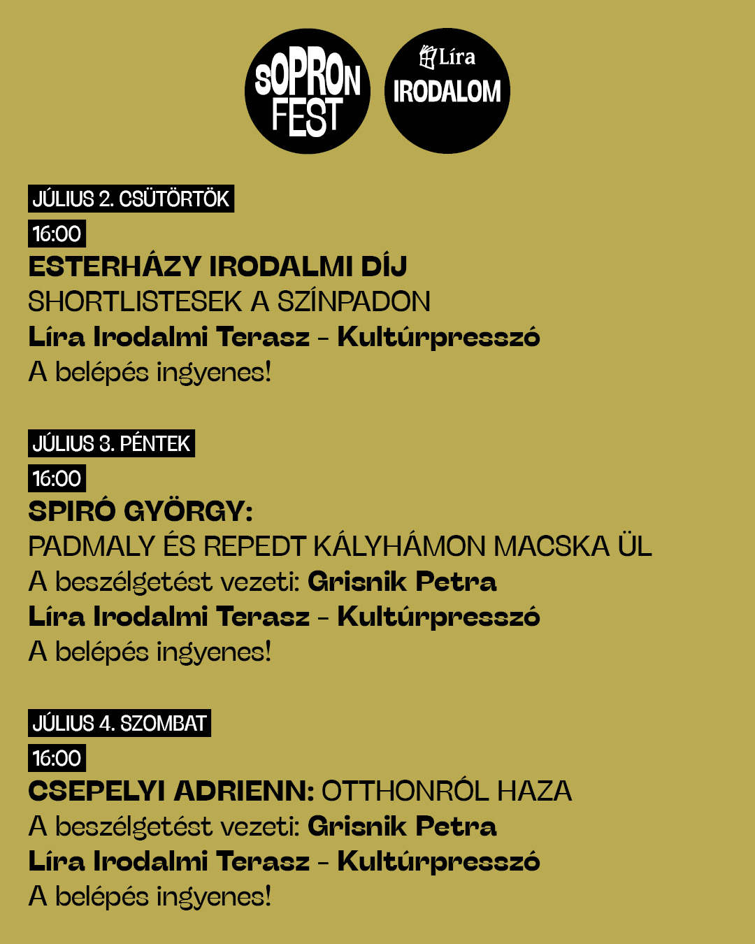 A SopronFest irodalmi programjai a Lírával együttműködésben három különleges beszélgetéssel várják az érdeklődőket, ahol a kortárs magyar irodalom sokszínűsége kerül fókuszba. A közönség találkozhat az Esterházy Irodalmi Díj 2026-os shortlistes szerzőivel, akik műveikről és alkotói szemléletükről mesélnek, miközben a következő délután Spiró György életművének meghatározó darabjai elevenednek meg, történelmi és személyes nézőpontból is árnyalt képet adva a közelmúltról. Az irodalmi sorozat harmadik programján Csepelyi Adrienn novelláin keresztül az otthon, az identitás és az úton levés kérdései kerülnek előtérbe, finom érzékenységgel és mély empátiával ábrázolva a hétköznapi emberi sorsokat. Mindhárom beszélgetés házigazdája Grisnik Petra lesz, aki személyes hangvételű, elmélyült diskurzusokra invitálja a szerzőket és a közönséget egyaránt.